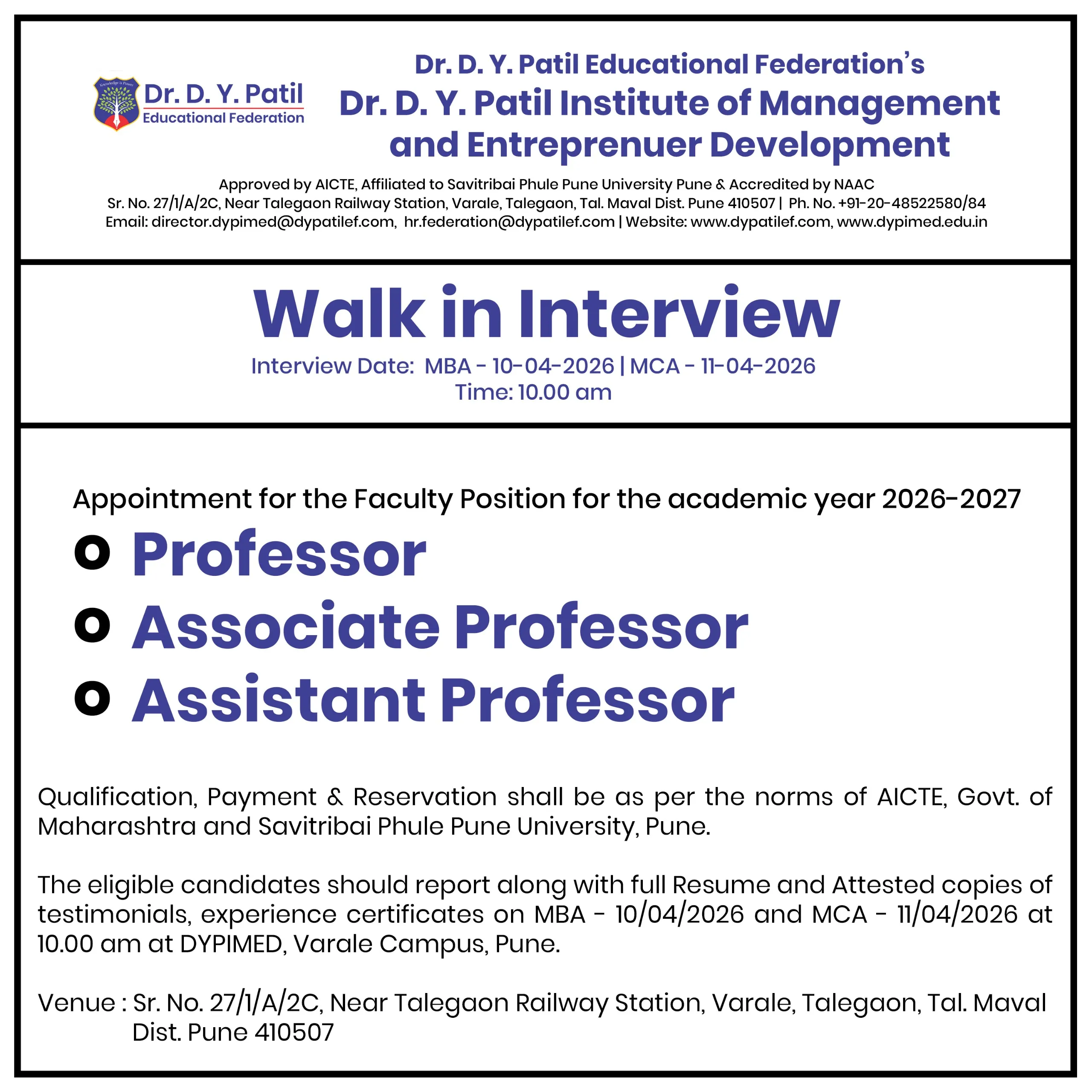 DR. D. Y. PATIL EDUCATIONAL FEDERATION’S DR. D. Y. PATIL INSTITUTE OF MANAGEMENT AND ENTREPRENEUR DEVELOPMENT, VARALE CAMPUS Approved by AICTE | Recognised by Govt. of Maharashtra | Affiliated to SPPU, Pune Accredited by NAAC | NBA Accredited MBA Program | DTE CODE: 6836