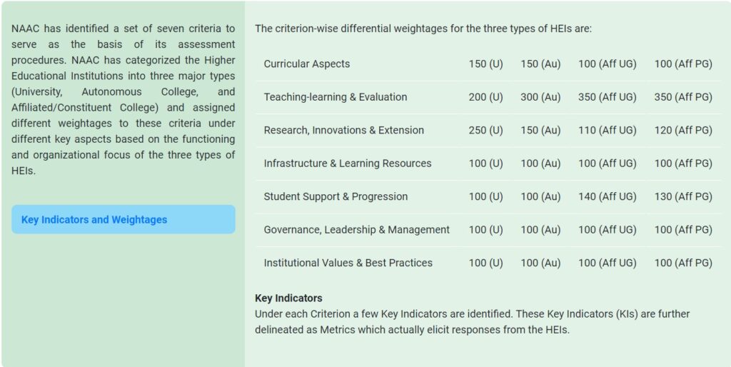 NAAC has identified a set of seven criteria to serve as the basis of its assessment procedures.